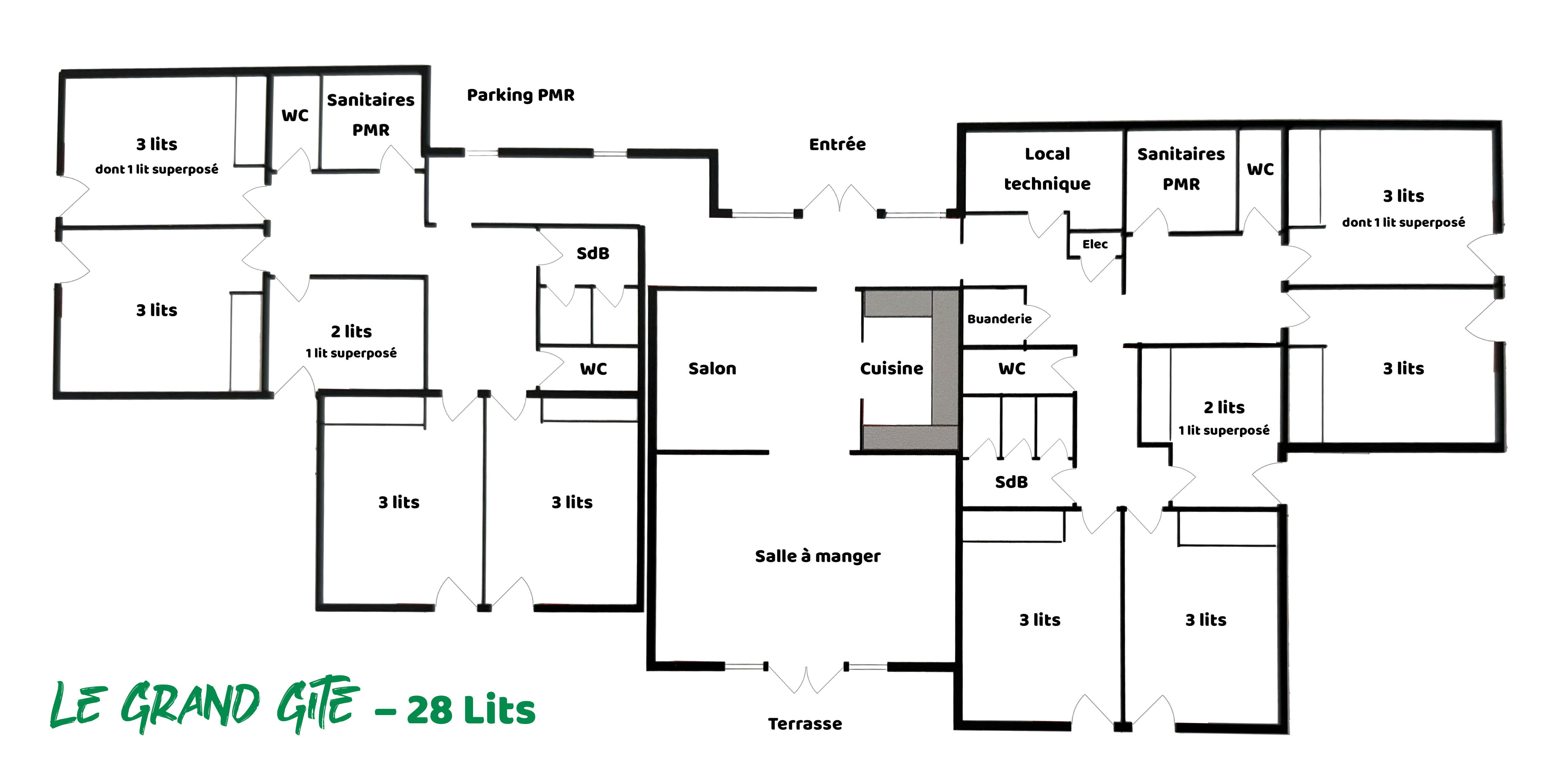 Ancienne colonie de vacances, l'hébergement vous accueille dans deux bâtiments proposant 75 lits au total, répartis en chambres de 2 à 6 couchages dont la majorité disposent de sanitaires complets. Nos salles de restaurant peuvent accueillir jusqu'à 120 personnes autour d'une cuisine assurée par notre équipe ou des traiteurs locaux.